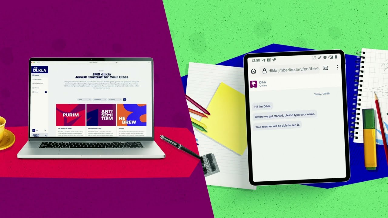 Delve deeper into the topics with additional links and recommended reading. In the short video tutorial, learn about all the features of JMB di.kla and how to integrate modules and mini-lessons into your classes. Learn more about other educational content and programming at the Jewish Museum Berlin.